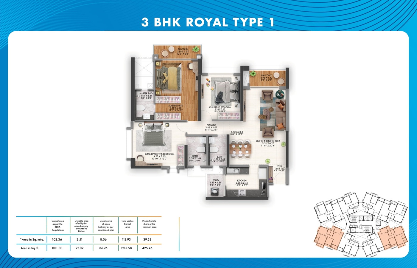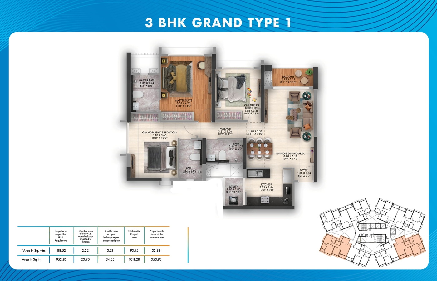 3 BHK Grand 1011.28 - 1039.48 Sq.Ft. ₹ 1.17 Cr* Onwards