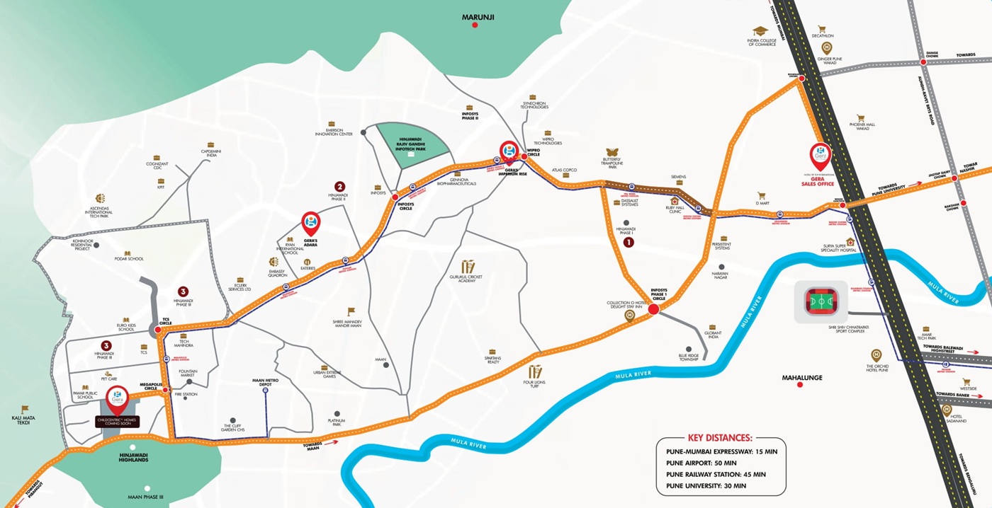 Hinjawadi, Pune’s thriving IT hub, is not just a business destination; it’s a vibrant community set for remarkable growth. Recent government initiatives, including road expansions and flyover constructions, promise enhanced connectivity and convenience. Establishing a 100-ton capacity solid waste management project further emphasizes the commitment to sustainable development in this dynamic locale. With lush greenery and modern amenities, Hinjawadi is perfect for families and professionals. Top schools like Vibgyor High and Indira National, along with premier healthcare facilities like Sanjeevan Hospital & Aditya Birla Memorial Hospital, ensure a supportive environment. Shopping at Balewadi High Street and Amanora Mall offers a mix of luxury brands and local boutiques, while entertainment at PVR Cinemas and Laxmi Lawns is just moments away. At Gera’s Joy on The Treetops, enjoy a lifestyle of comfort and convenience. Your tranquil home is close to the city’s hustle and bustle, allowing you to invest in a thriving community that meets all your needs.